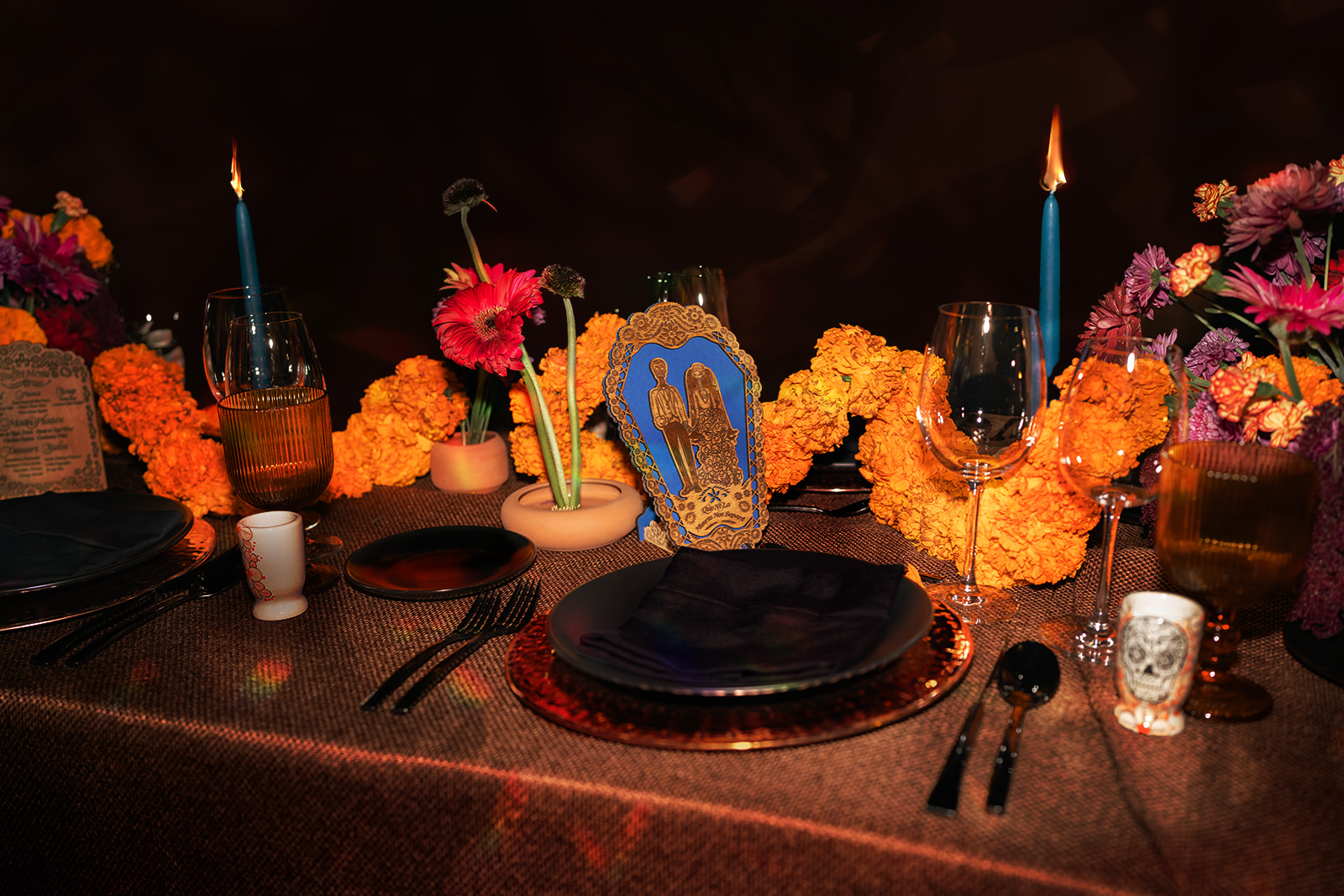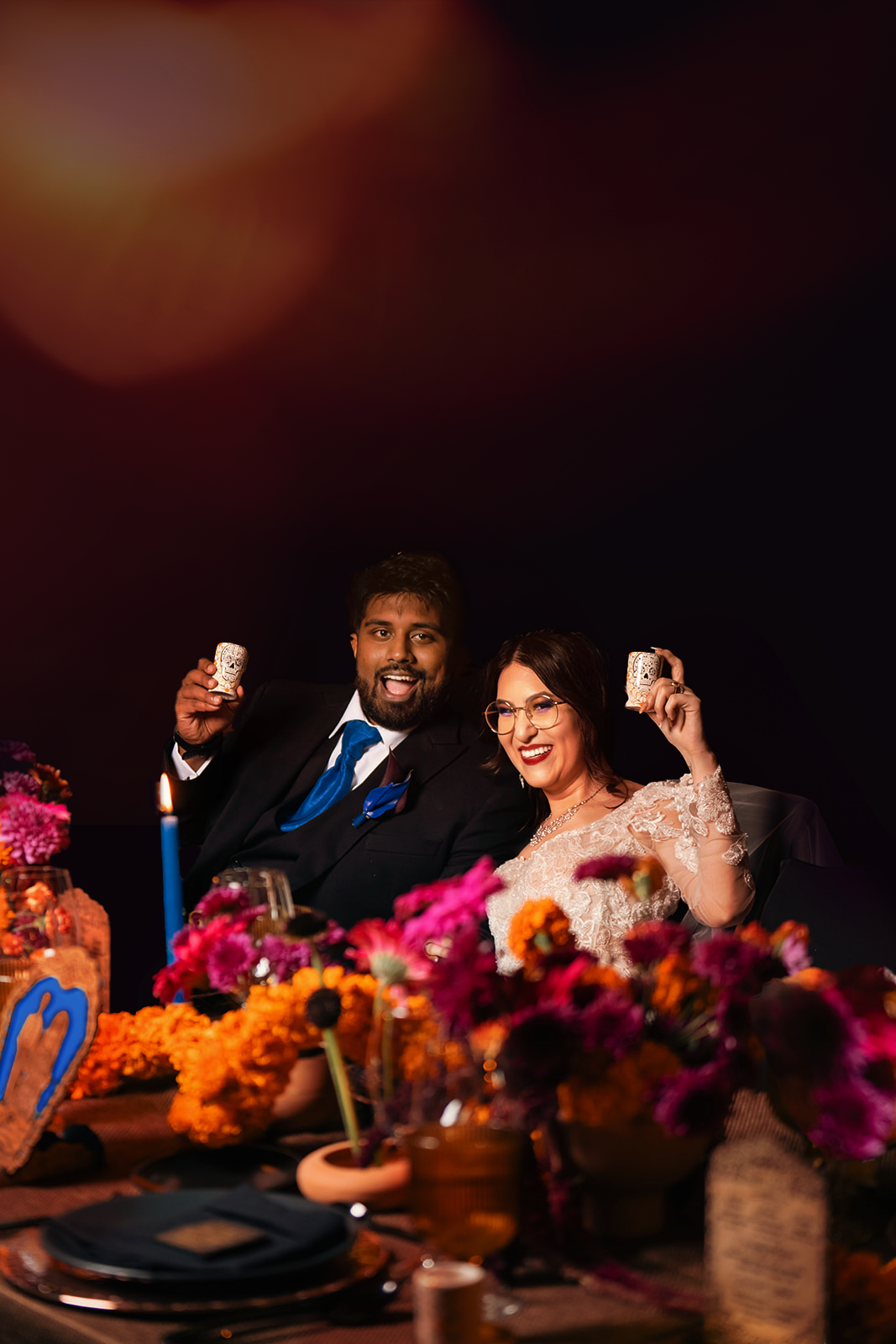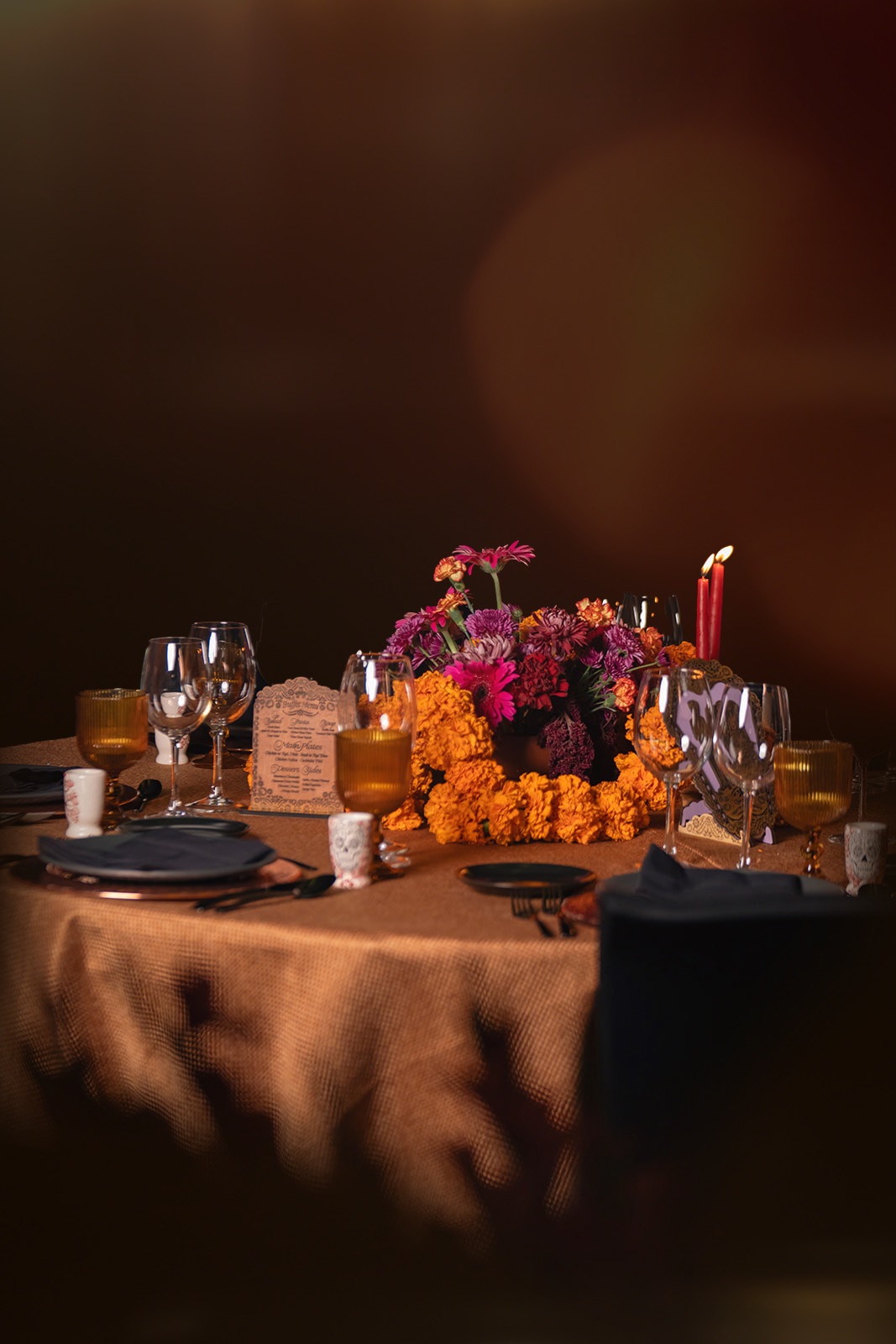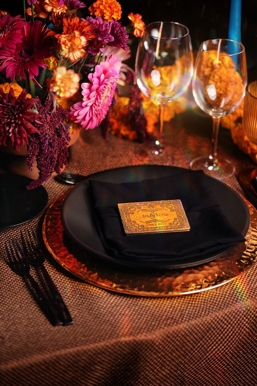 The wedding taking place on Day of the Dead presented the opportunity to celebrate my heritage by leaning into the sentiments of what the holiday represents to Mexicans: reverence for family, eternity, and amity. There was a fine line to walk to make sure the design didn’t communicate the morbid, or tacky versions of the holiday. It was imperative to me to include my husbands' Indian heritage – partially done by including Cempasúchil flowers as the main flower because it is culturally significant for both of our cultures. For him, the Hindu symbolism of Surya Dev represented the universe shining brightly on us and the purity of our relationship.