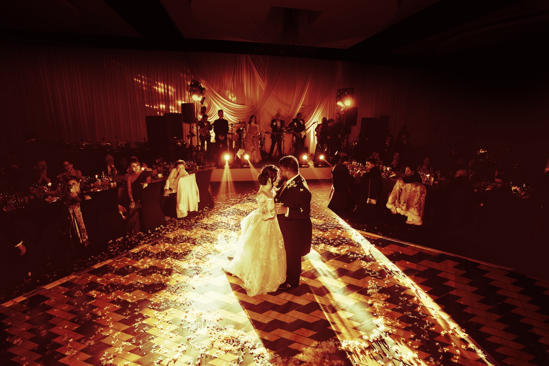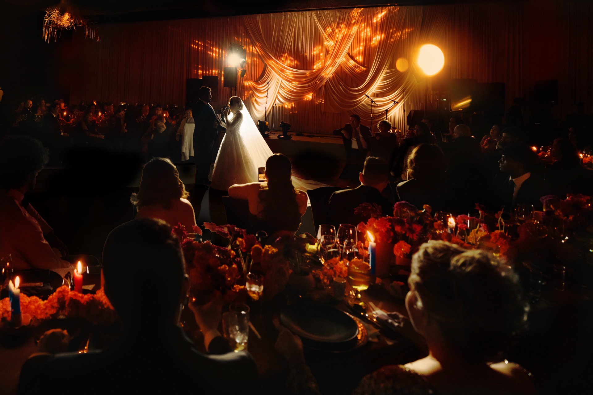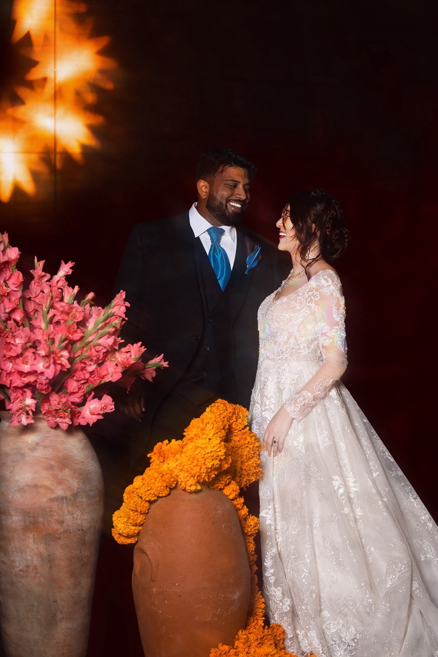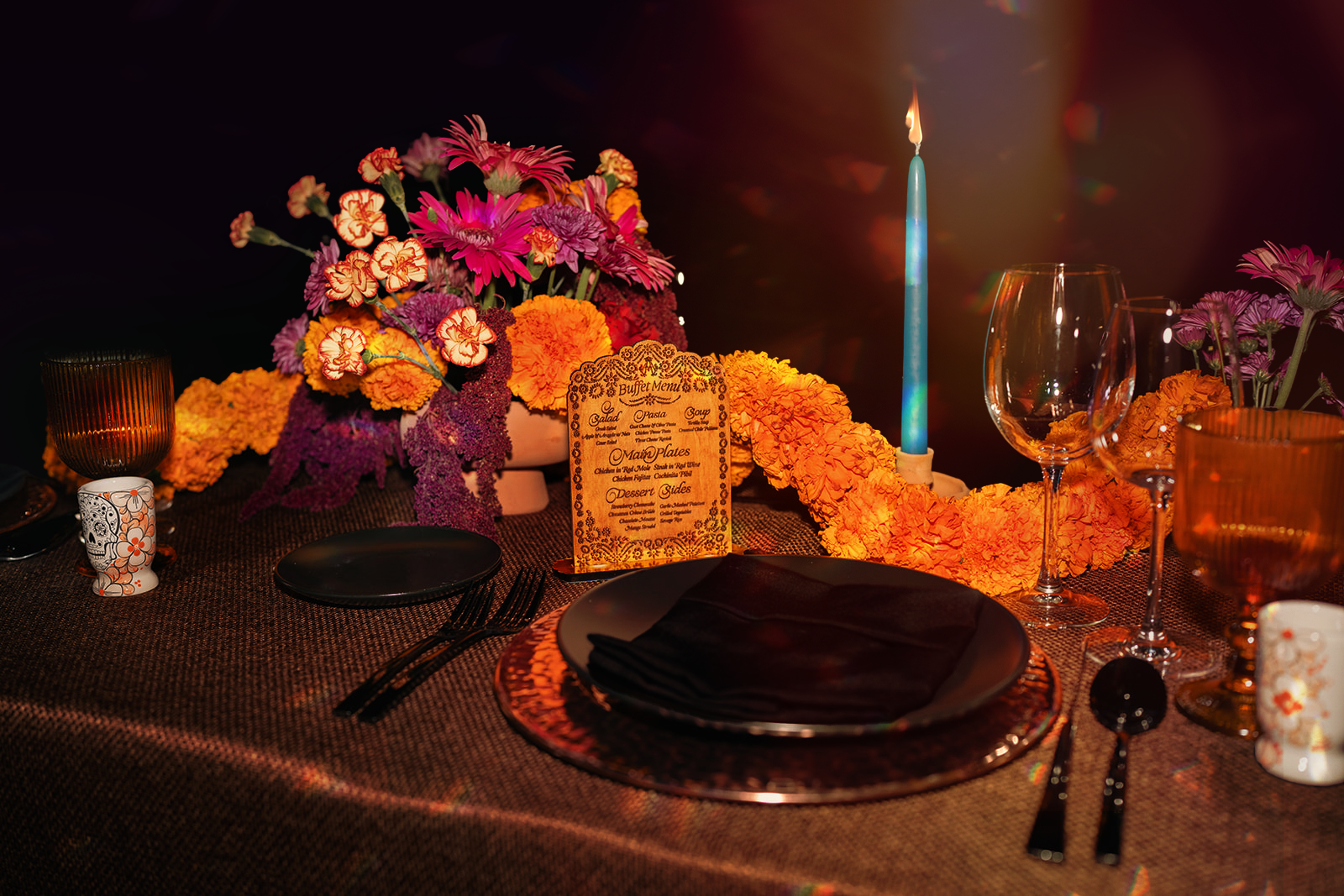 The wedding taking place on Day of the Dead presented the opportunity to celebrate my heritage by leaning into the sentiments of what the holiday represents to Mexicans: reverence for family, eternity, and amity. There was a fine line to walk to make sure the design didn’t communicate the morbid, or tacky versions of the holiday. It was imperative to me to include my husbands' Indian heritage – partially done by including Cempasúchil flowers as the main flower because it is culturally significant for both of our cultures. For him, the Hindu symbolism of Surya Dev represented the universe shining brightly on us and the purity of our relationship.